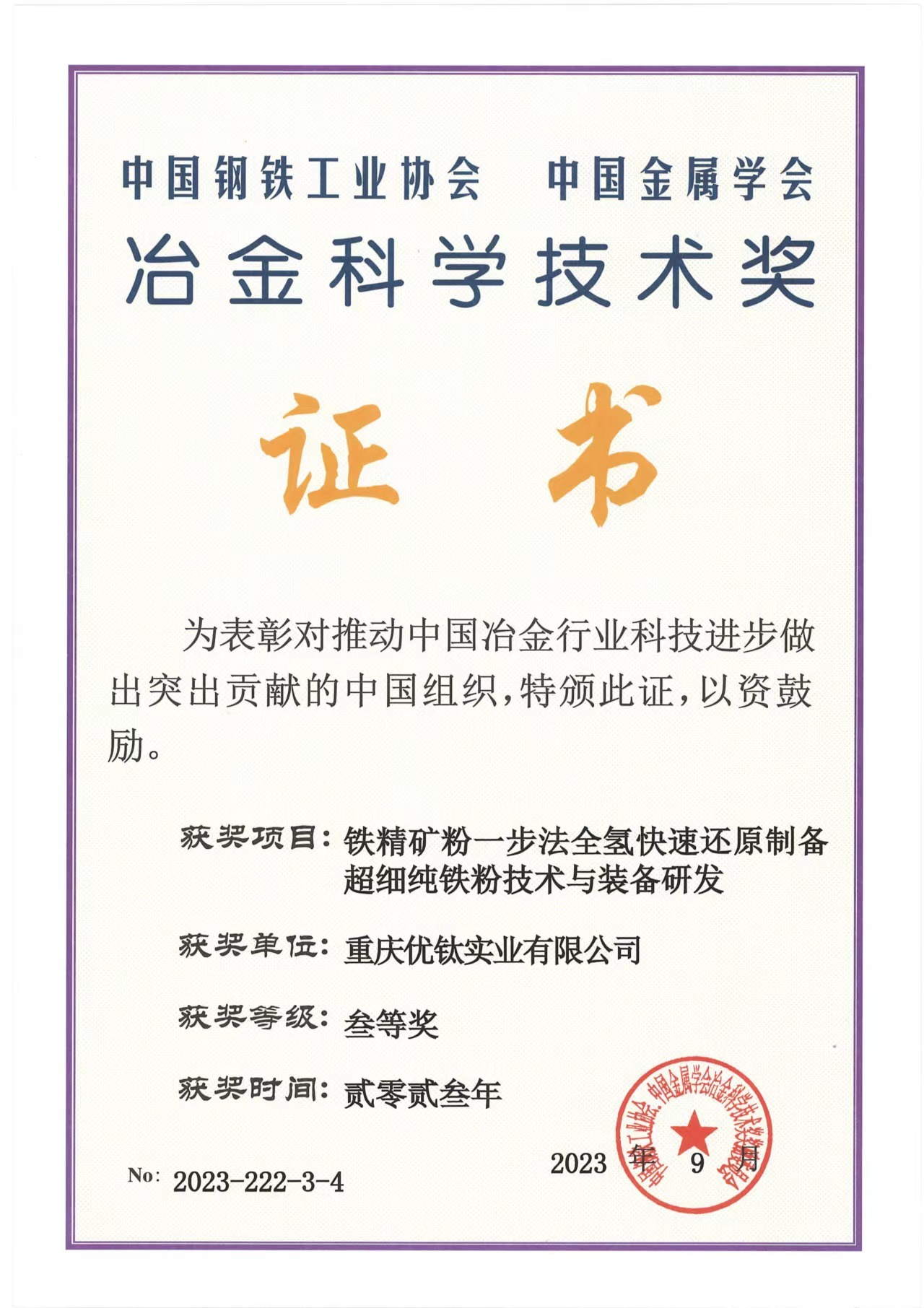 喜報:熱烈慶祝優(yōu)鈦實業(yè)超細鐵粉項目獲評 “冶金科學(xué)技術(shù)獎三等獎”