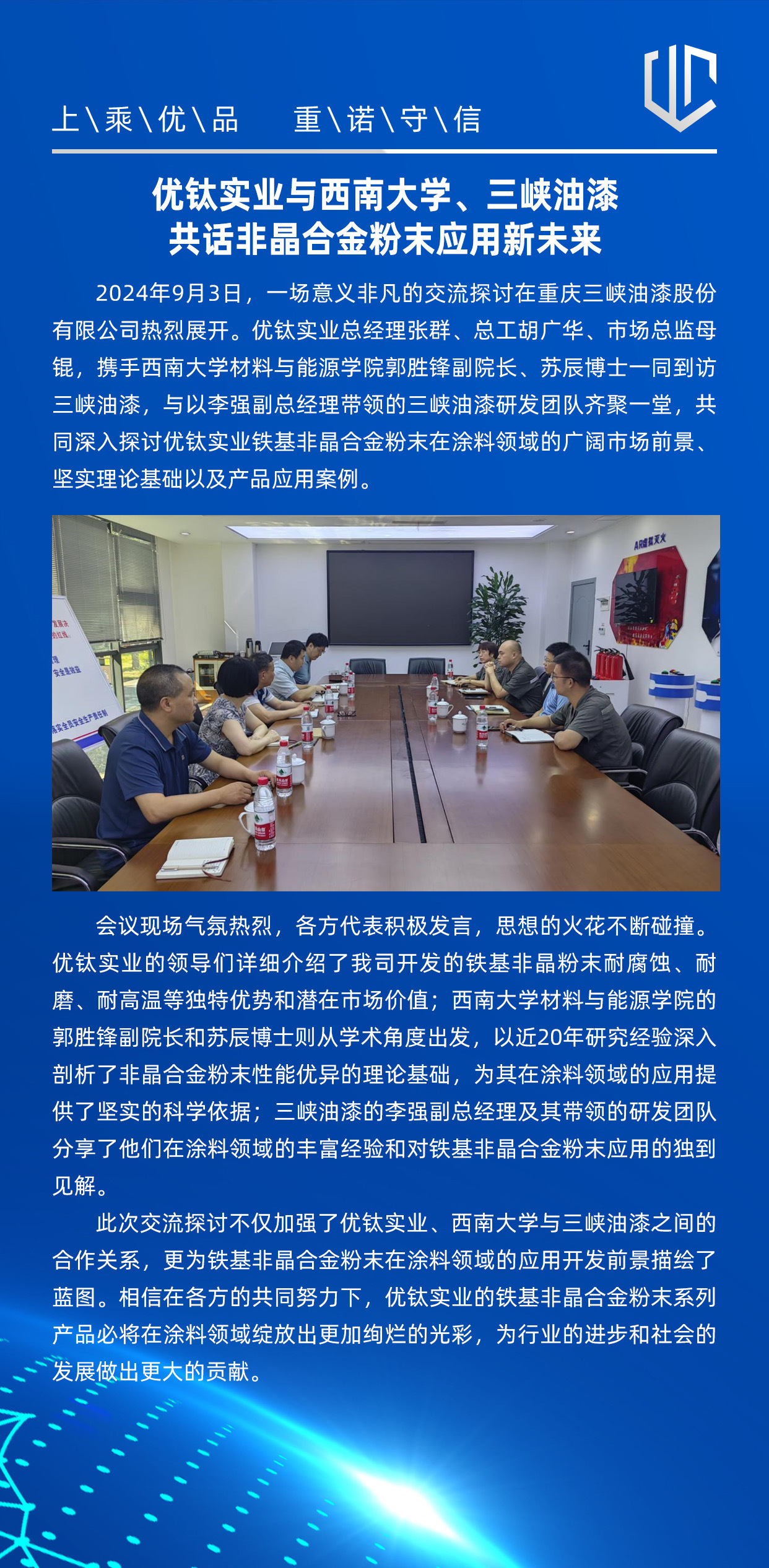 優(yōu)鈦實業(yè)與西南大學(xué)、三峽油漆共話非晶合金粉末應(yīng)用新未來