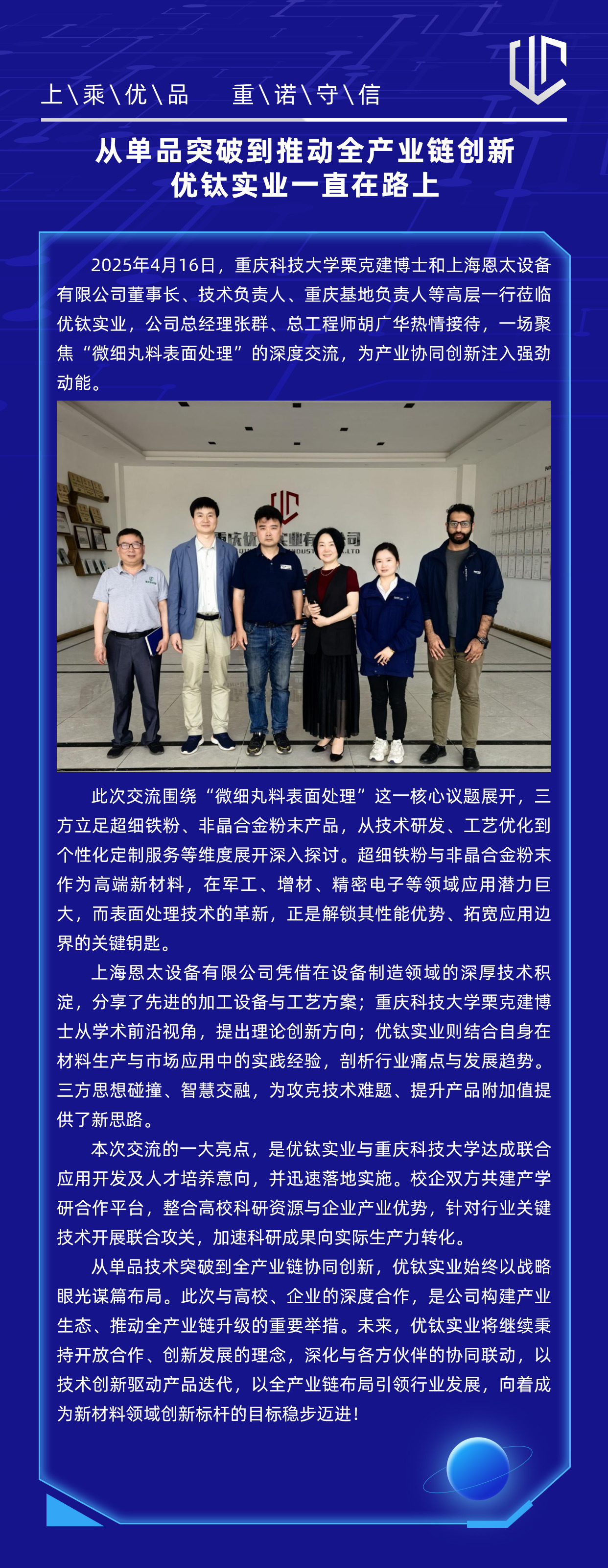 近日,上海交通大學(xué)特聘研究員馮悅嬌、上海交通大學(xué)重慶研究院項(xiàng)目主管楊禮睿及項(xiàng)目助理陳浩一行到訪優(yōu)鈦實(shí)業(yè),受到公司總經(jīng)理張群、總工程師胡廣華、營(yíng)銷總監(jiān)母錕的熱情接待。值得一提的是,優(yōu)鈦實(shí)業(yè)全體新員工懷著對(duì)上海交大這所高等學(xué)府的崇敬之情,全程列席了本次交流會(huì)議,共同感受前沿學(xué)術(shù)與產(chǎn)業(yè)實(shí)踐的碰撞。